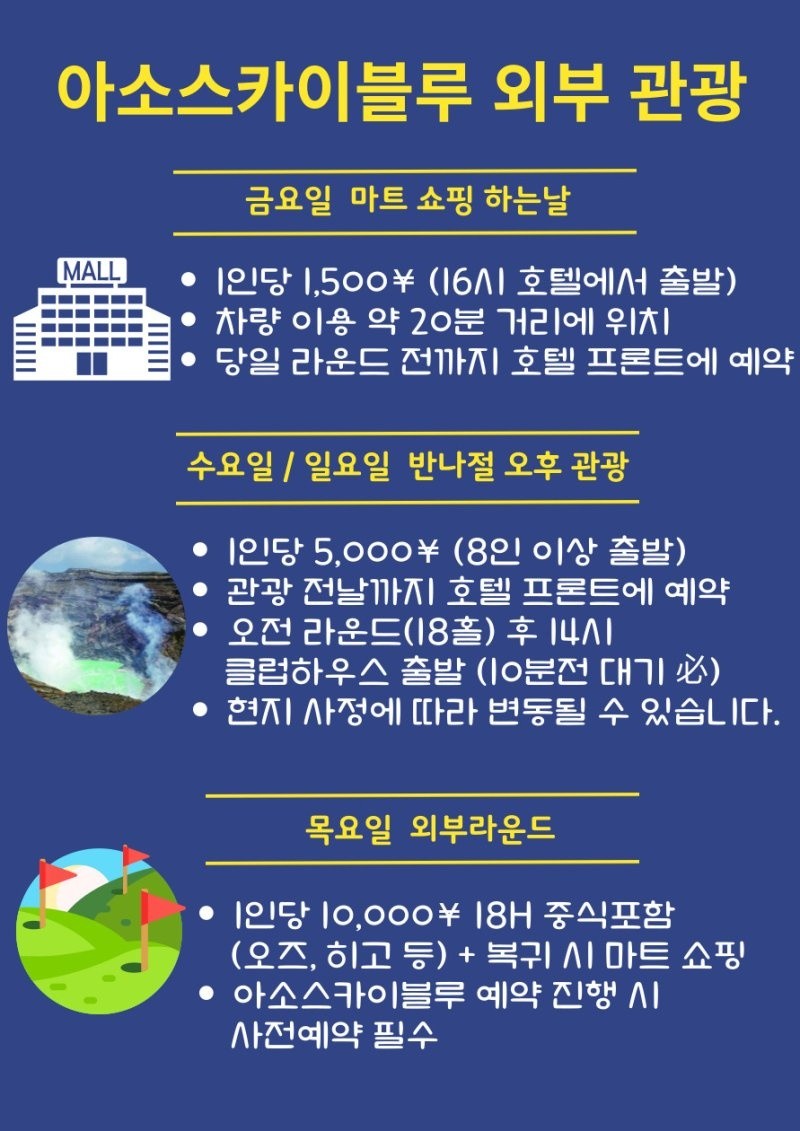 - ๊ณจํ (์ฒซ๋ 18ํ,์ฒด๋ฅ์ผ18ํ + 9ํ์๋น์ค,๊ท๊ตญ์ผ 0ํ)