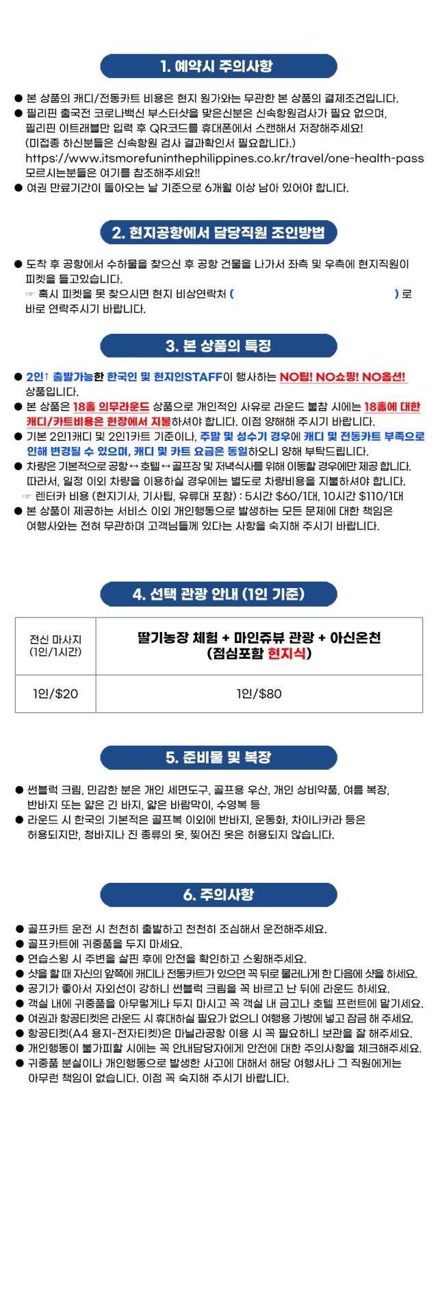 ● 본 상품은 18홀 의무라운드 상품으로 개인적인 사유로 라운드 불참 시 18홀에 대한 캐디/카트비용은