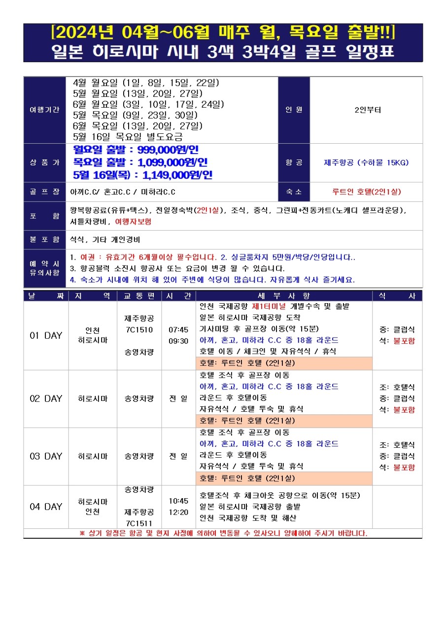 #히로시마골프 #4월~6월특가 #매주월/목요일 #3박4일 #2인이상