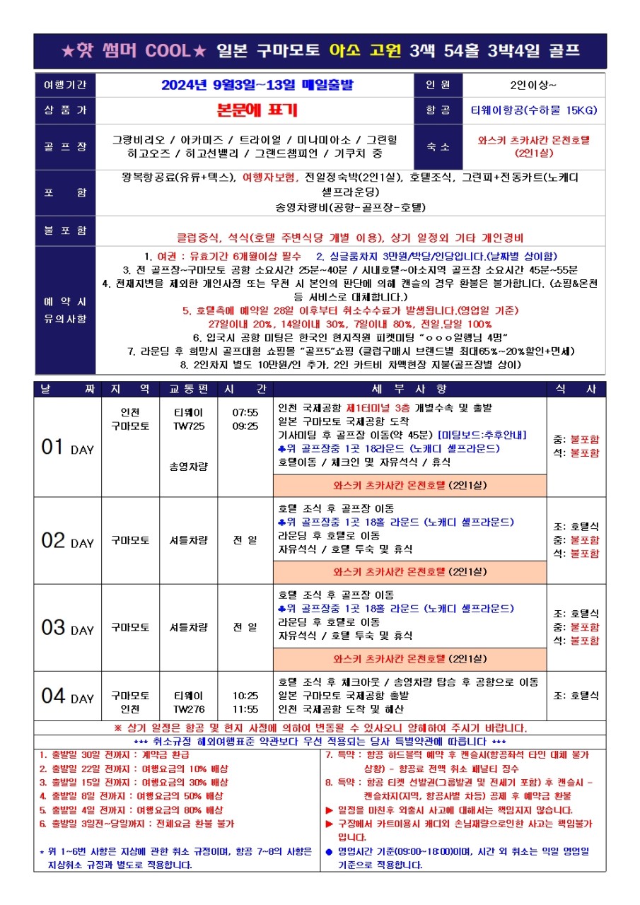 ⚫천재지변을 제외한 개인사정 또는 우천 시 본인의 판단에 의해 캔슬의 경우 환불은 불가합니다. (쇼핑&온천 등 서비스로 대체합니다.)