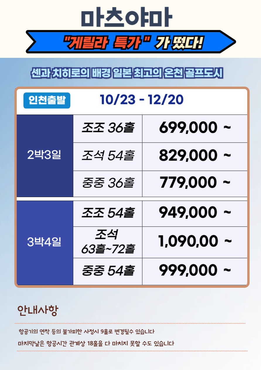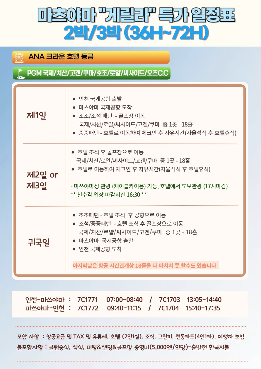 🍀★인천출발 마츠야마 골프 36홀~54홀 게릴라 특가★