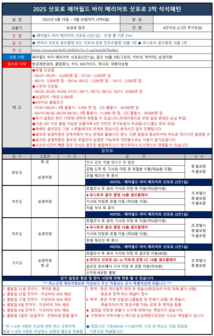 - 04/19-06/30, 08/30-09/30 | 3명 출발시 : 11,000 엔 업, 2인 출발시 : 39,000엔 업