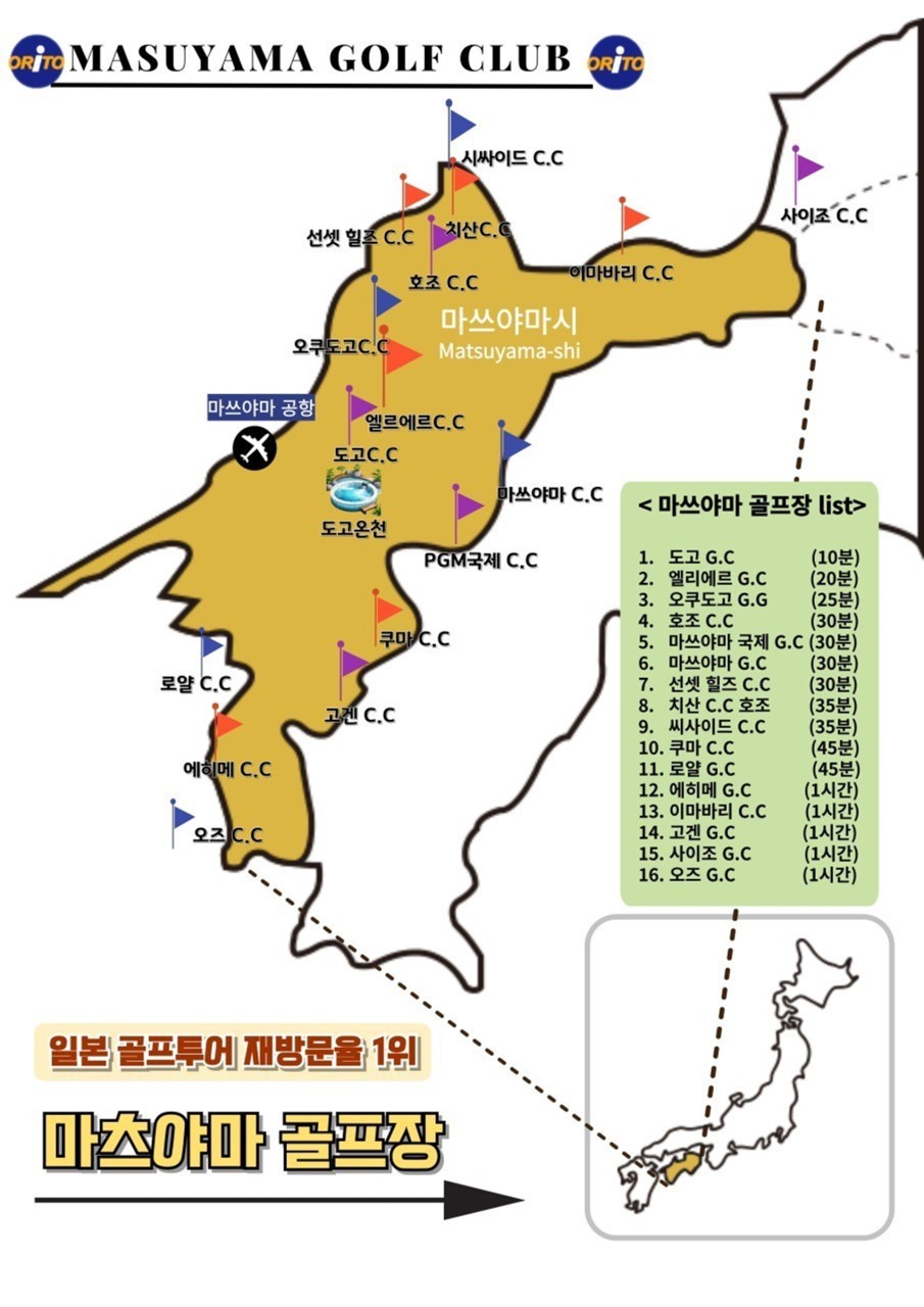 ∎골프 후 가능한 관광지 : 마쓰야마성, 오카이도상가, 마쓰야마2번가 // 도고온천 본관, 봇짱열차 전시관(전차로 이동) 등 ∎