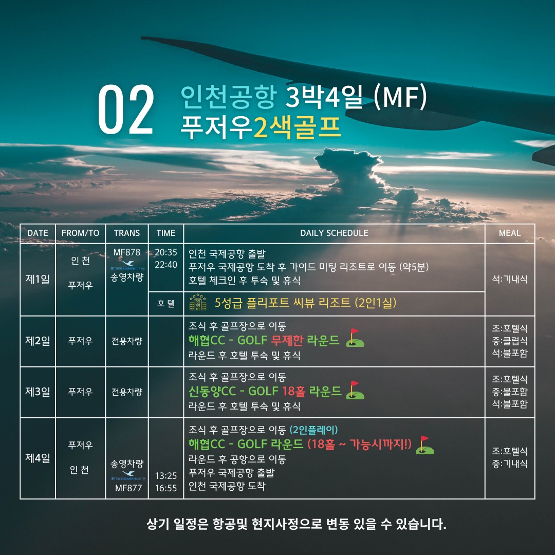 ★무제한골프 상품과 플리포트2색골프는 푸저우 공항 옆 5분거리 해변가 5성급 씨뷰 플리포트리조트 사용이 기본이며, VIP3색골프는 푸저우시내 정5성 쉐라톤호텔 이용합니다.