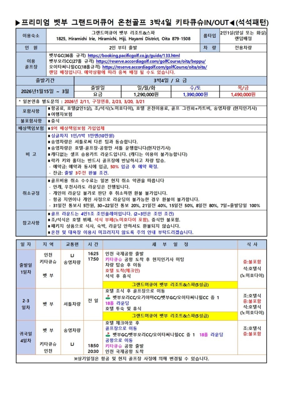 ♨프리미엄 벳부 그랜드머큐어 온천골프 <3박4일>