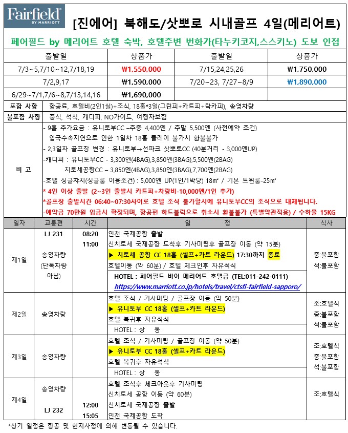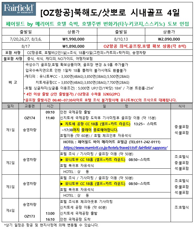 호텔: 메리어트호텔 / 골프장 : 치토세공항,유니토부CC(선파크,기타히로시마CC)