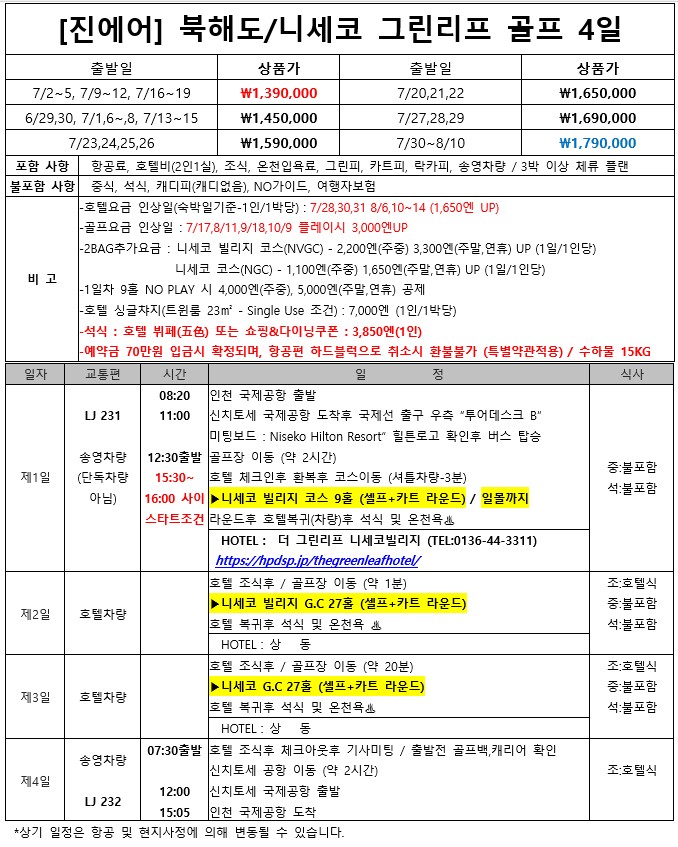 1. 니세코 그린리프 골프 4일 (2인출발 가능) 139만원~