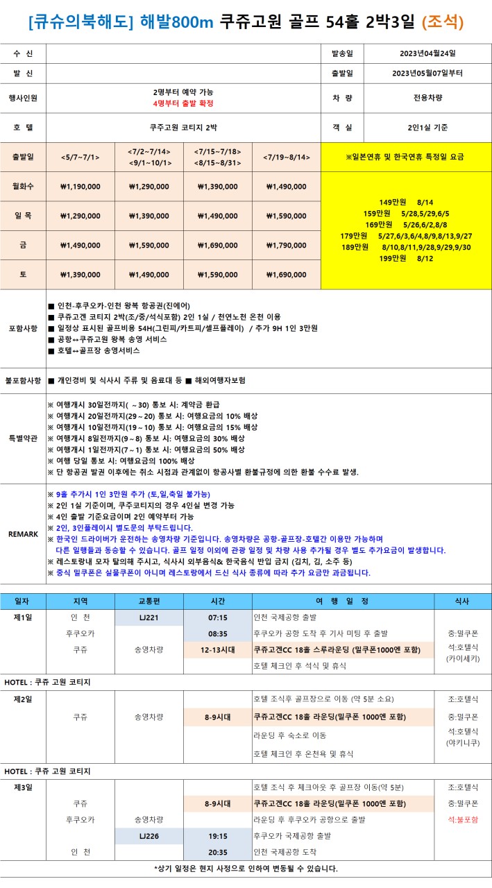 방블록 및 티오프 타임 확보한 상품 입니다.