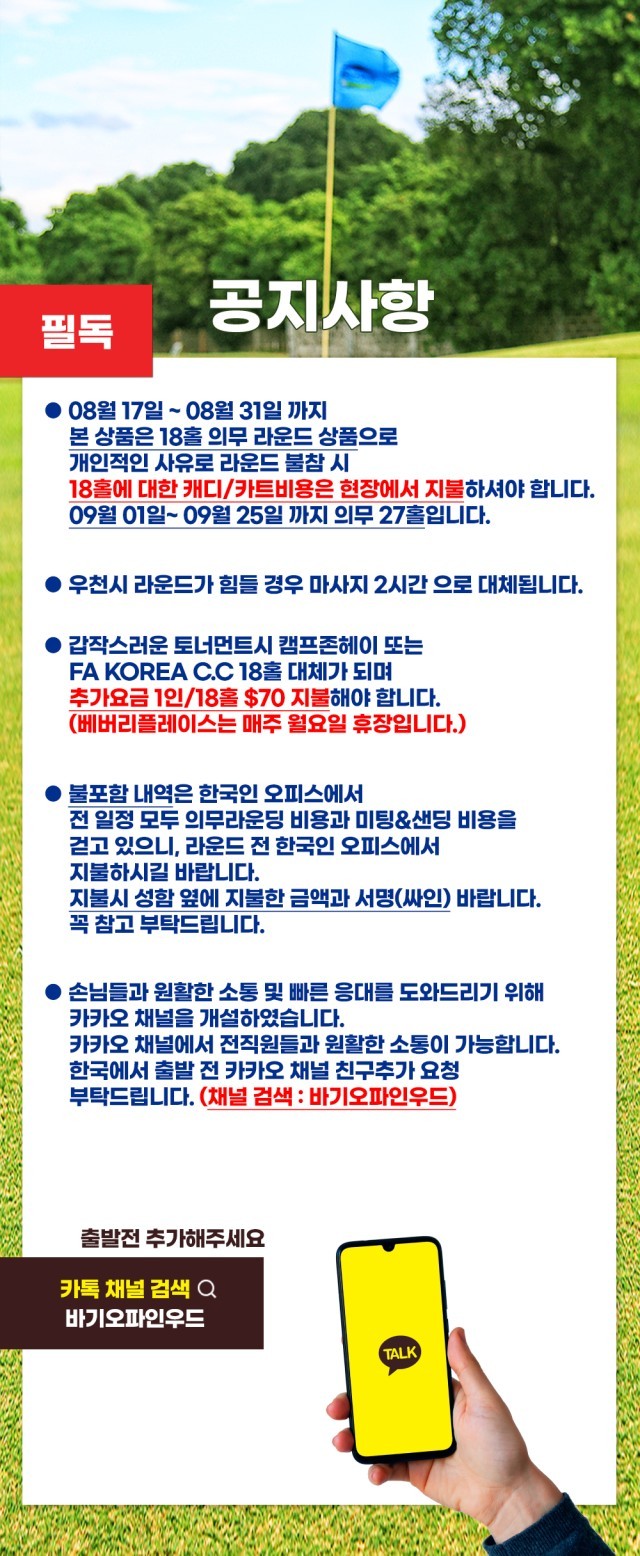 ● 캐디피,팁+카트비 ($50/18홀, $70/27홀, $90/36홀 – 2인1캐디/2인1카트 기준)